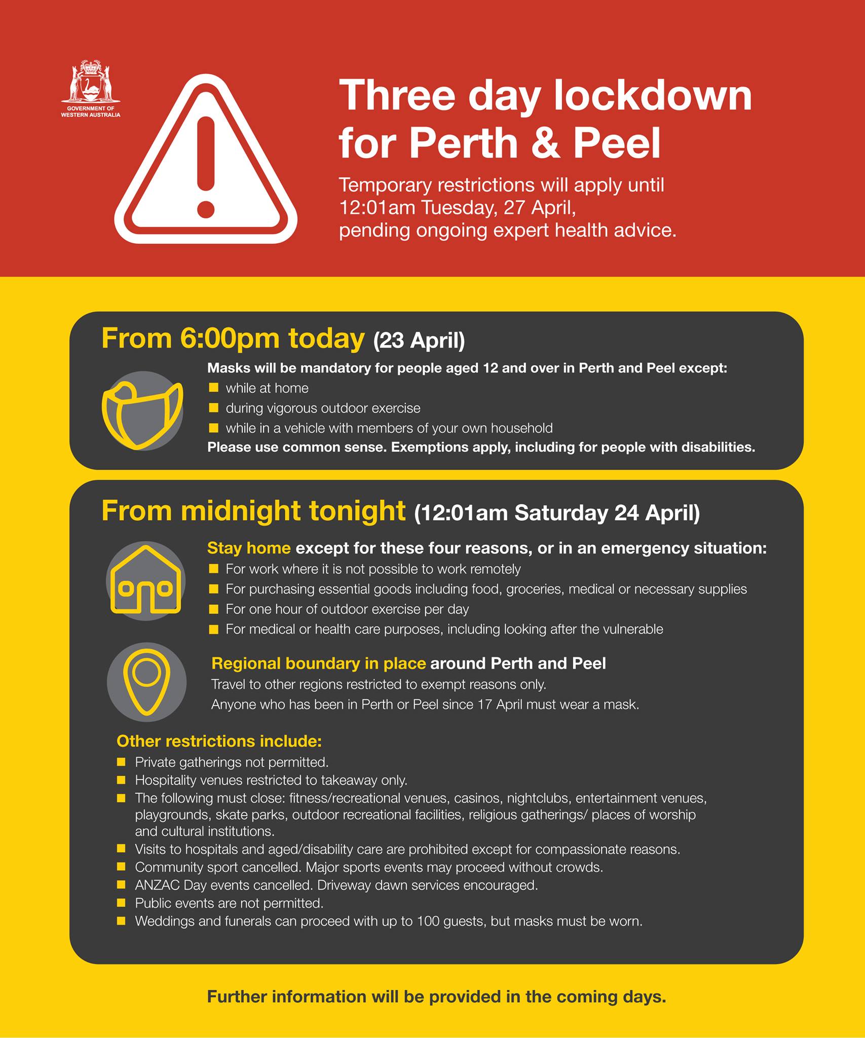 - Mask wearing will be mandatory when outside your home, except when exercising (this includes regional NSW until 28 August)