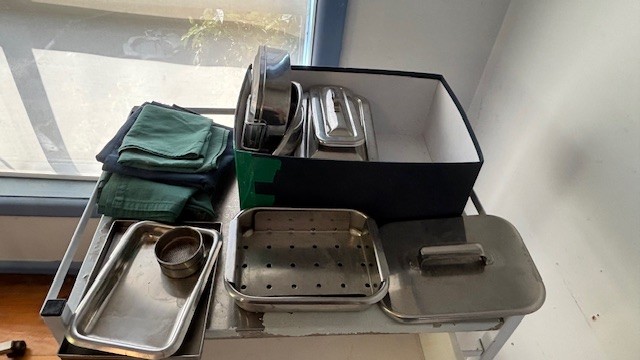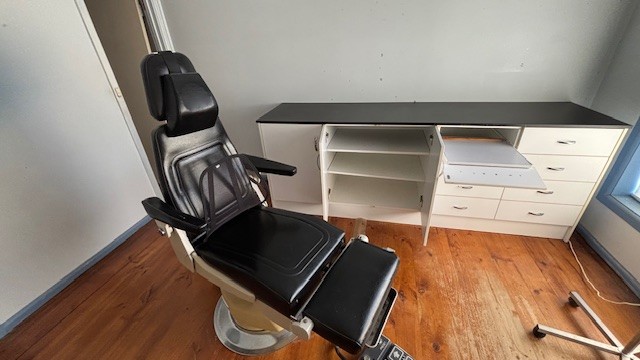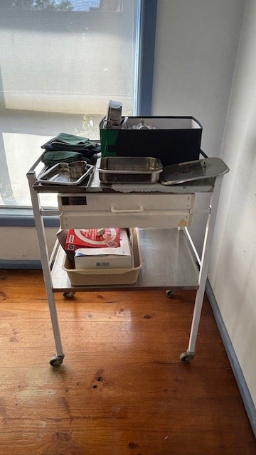 Chair, work bench (cabinet), trolley and miscellaneous equipment.