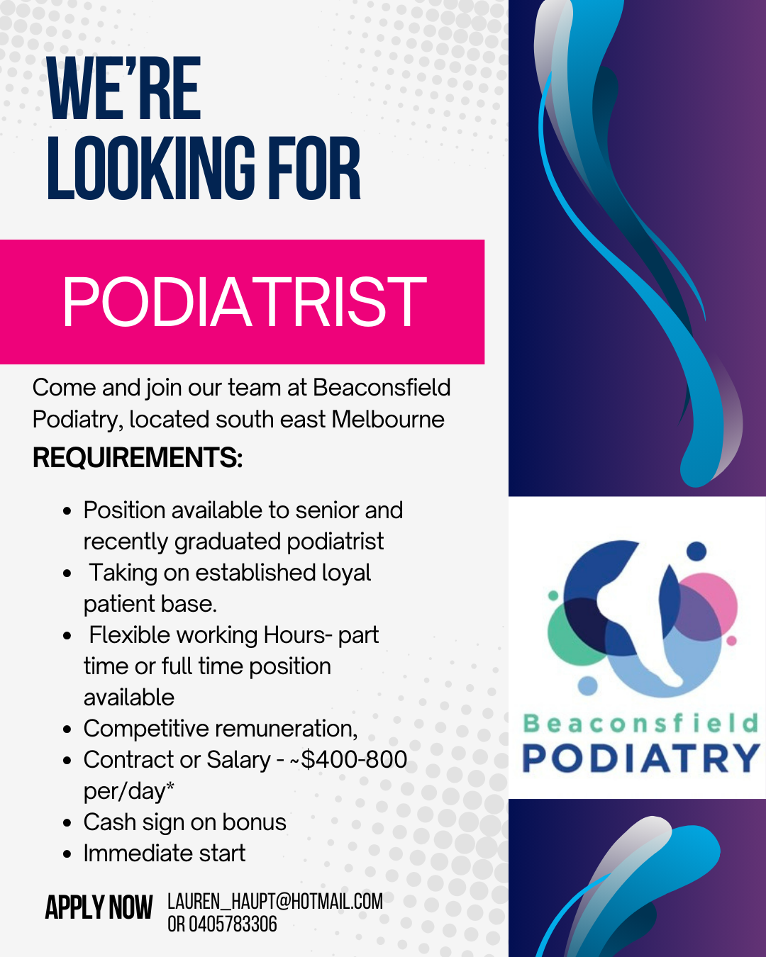 Beaconsfield Podiatry is a busy well established practice located in the south east suburbs of Melbourne. We are looking for a friendly, passionate podiatrist, with a keen interest in general practice, orthotics and biomechanics, diabetes assessment and nail surgery.