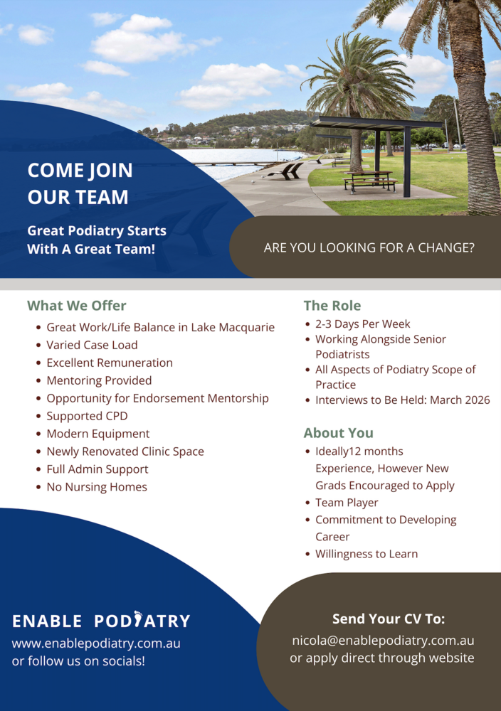 Send your CV and cover letter to nicola@enablepodiatry.com.au
