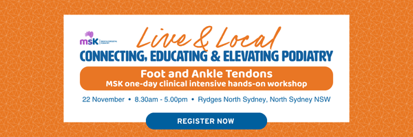 | This one-day event offers a comprehensive exploration of lower leg tendon conditions. Designed for podiatrists seeking to deepen their clinical expertise, the program covers the full spectrum of assessment, diagnosis, and management strategies. Participants will then delve into clinical diagnosis, learning how to gather and interpret subjective and objective information, identify mechanisms of injury, and differentiate between various tendon pathologies and associated conditions. Imaging interpretation will be discussed, with guidance on when and why to refer for ultrasound or MRI, particularly in cases of diagnostic uncertainty or suspected rupture. The event also explores the biomechanics of foot function and its role in tendon overload, offering practical approaches to gait assessment and clinical testing. | Attendees will gain insights into effective footwear and orthoses prescriptions to support recovery and prevent recurrence. Rehabilitation principles will be a key focus, including progressive loading strategies, pain monitoring, and return-to-activity planning. Adjunct treatments such as shockwave therapy, injections, referrals to medical professionals and the role of collaboration with other allied health professionals and specialists will be reviewed, along with strategies for managing challenging cases and communicating effectively with patients. The day concludes with a collaborative discussion of complex cases, providing an opportunity for shared learning and clinical reflection before a great networking opportunity with like-minded podiatrists. View the full program here >>  |